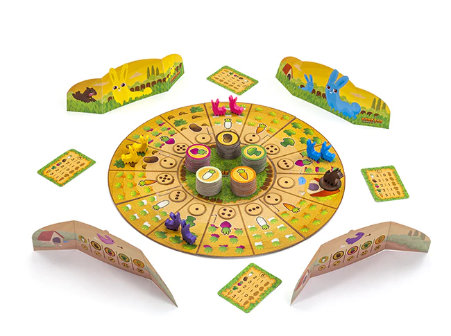 Un desafío de estrategia con una innovadora mecánica. Cada jugador deberá mover sus conejos por diferentes zonas de cultivo y recolectar hortalizas para sumar puntos.