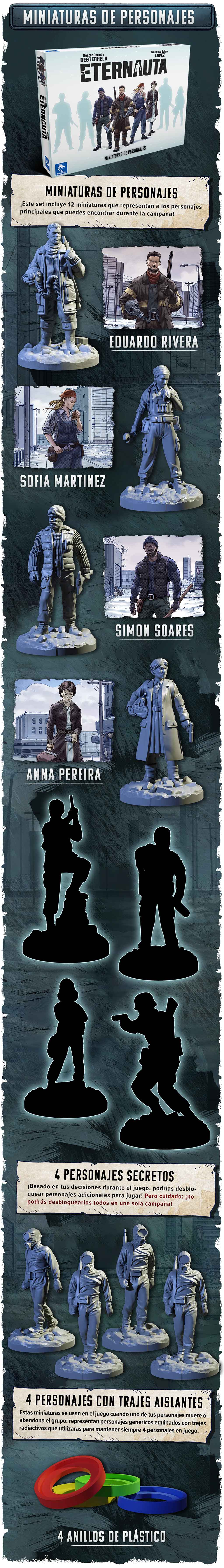 – 4 miniaturas de personajes secretos (para desbloquear durante la partida).